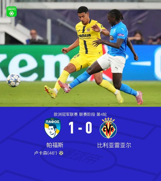 第46分钟,塞马开出角球,卢卡森头球破门,帕福斯1-0比利亚雷亚尔