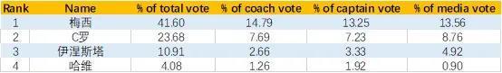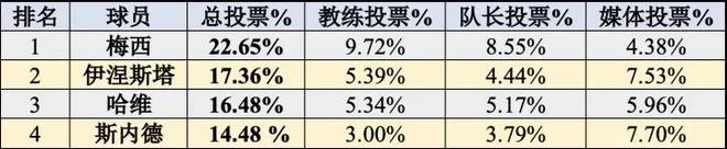 至于说一直都喋喋不休的里贝里则根本无法撼动这三位巴萨巨星的排名,毕竟在教练投票和队长投票上面他都是最低的。