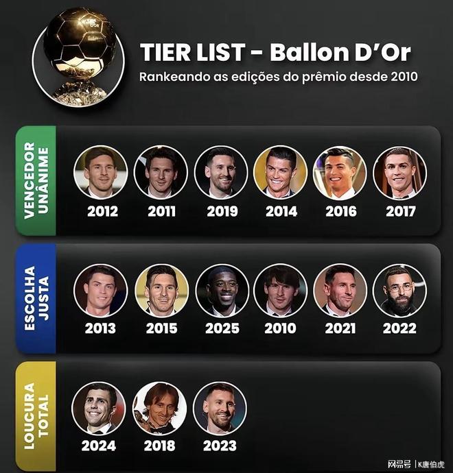 写到结尾处,最有争议的三个金球奖分别是2024年的罗德里,对此弗洛伦蒂诺连续的皇马已经连续两年缺席颁奖典礼以示抗议。2018年的莫德里奇出人意料地成为了罗梅之后的第一个金球奖获得者,坦率来说这个金球奖理应是C罗的。2023年的梅西靠着世界杯的余温直接封神,然而这一次的认证更多地就像是主办方及相关团体的一次造神运动,因为这已经严重脱离了奖项评选的公正性。